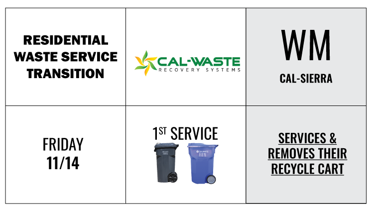 On November 14th, Cal-Waste will begin servicing residential trash and recycling carts, while Waste Management removes their remaining trash carts.